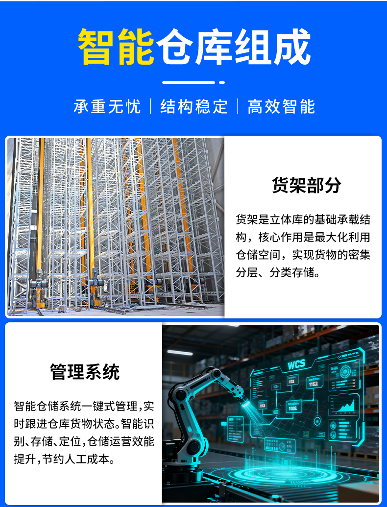 ★儲(chǔ)存裝置:橫梁貨架立體庫的儲(chǔ)存裝置采用多層儲(chǔ)存式貨架結(jié)構(gòu),在每層貨架中配備多個(gè)貨物存儲(chǔ)單元。通過自動(dòng)化機(jī)器人技術(shù)將貨物從入口橋臂上抓取并運(yùn)輸?shù)较鄳?yīng)的貨物存儲(chǔ)單元,實(shí)現(xiàn)貨物的自動(dòng)存儲(chǔ)和自動(dòng)取貨。